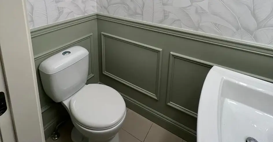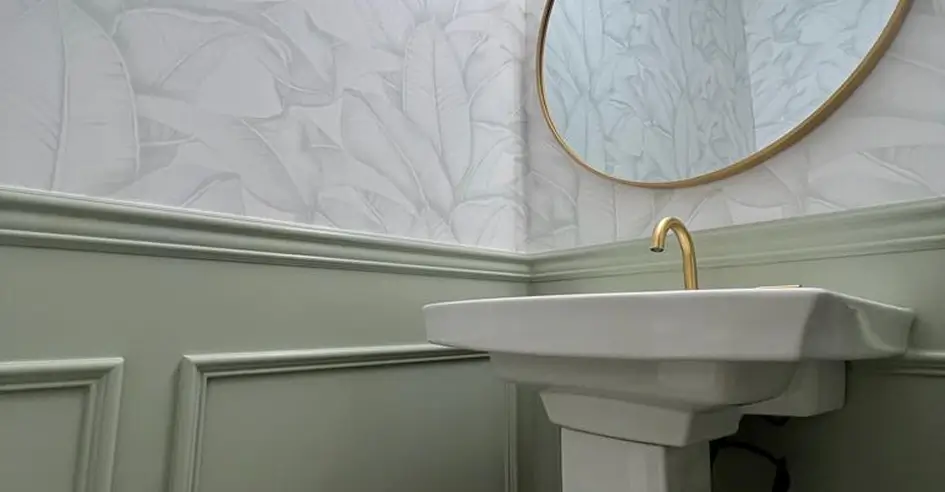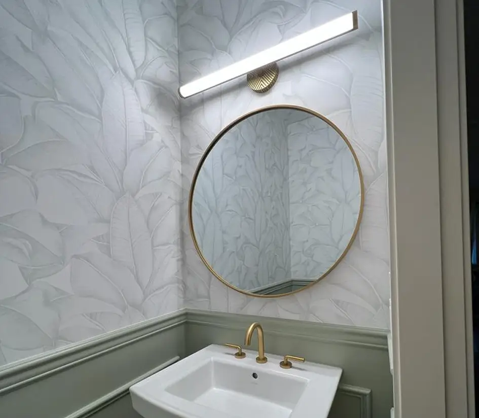 Wallpaper was installed at the upper part, including the ceiling, to create a welcoming airy feeling. Vintage brass fixtures complemented the look.