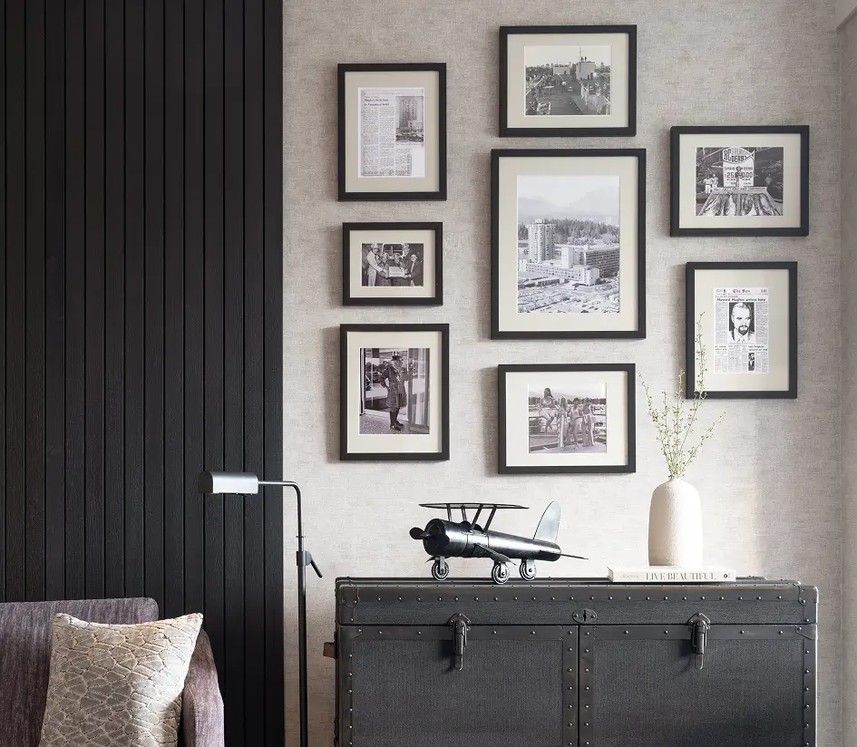Bold furniture, stone tables, and metal accents reflect the strength of the era, while warm amber lighting softens the atmosphere. The result is a structured, masculine space layered with the quiet tension of a classic noir film.